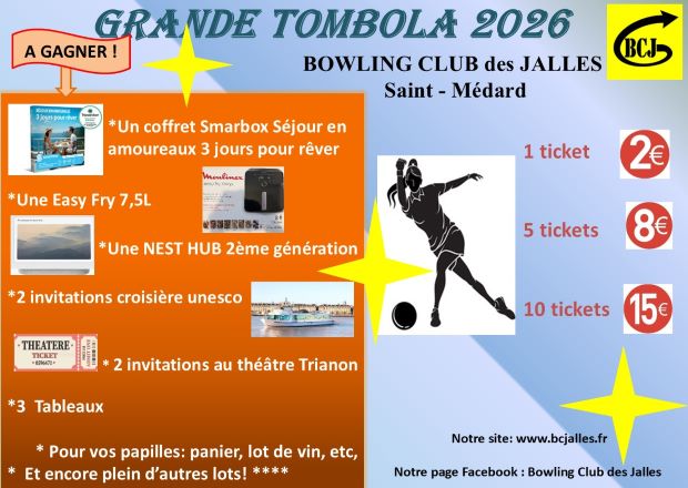 Lors de la pause repas de notre tournoi des Jalles, le 19 avril prochain, se déroulera le tirage de notre tombola. Les tickets sont en vente auprès du bureau et au bowling de Mériadeck. N'hésitez pas à en prendre, de nombreux lots sont à gagner.